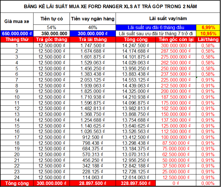 Bảng tính lãi suất mua xe bán tải Ford Ranger trả góp trong 2 năm