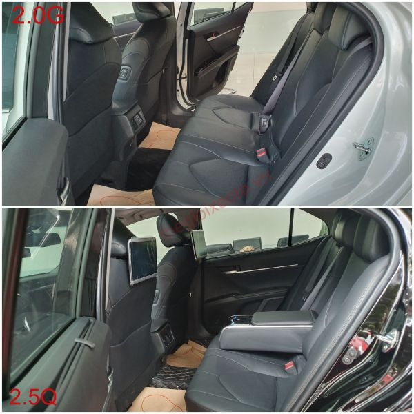 Về tính năng tiện ích thì trên Camry 2.5Q có hàng ghế thứ 2 tiện ích hơn hẳn như tựa tay có tích hợp chỉnh ngả lưng ghế điện cho hàng ghế thứ 2, rèm che nắng cửa sau, hệ thống điều hòa vùng riêng, cùng cửa sổ trời trong khi đó thì Camry 2.0G không có những trang bị trên.