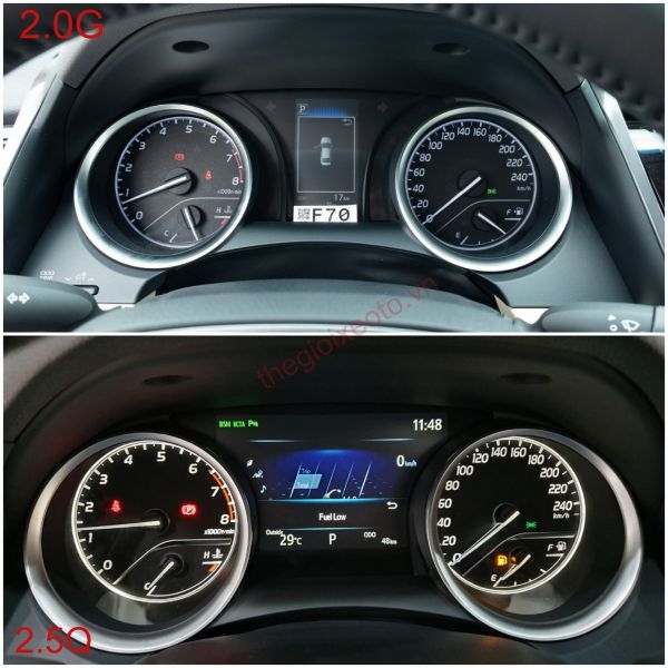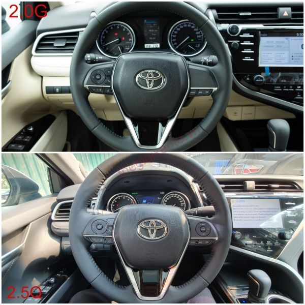 Về vô lăng thì Camry 2.0G không được tích hợp tính năng ga tự động, không có điều chỉnh vô lăng điện và nhớ vị trí vô lăng. Trên Camry 2.5Q được trang bị tính năng ga tự động và có vô lăng chỉnh điện tích hợp nhớ vị trí vô lăng.