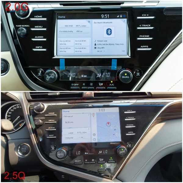 Camry 2.0G trang bị màn hình DVD 7" không có định vị GPS cũng như loa JBL, trong khi đó trên Camry 2.5Q được trang bị màn hình cao cấp hơn có kích cỡ 8" tích hợp định vị toàn cầu GPS và hệ thống giải trí cao cấp với 9 loa JBL cho trải nghiệm về âm thanh tuyệt vời hơn so với bản Camry 2.0G. Ngoài ra thì Camry 2.0G chỉ được trang bị điều hòa tự động 2 vùng trong khi Camry 2.5Q được trang bị điều hòa 3 vùng độc lập.