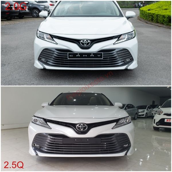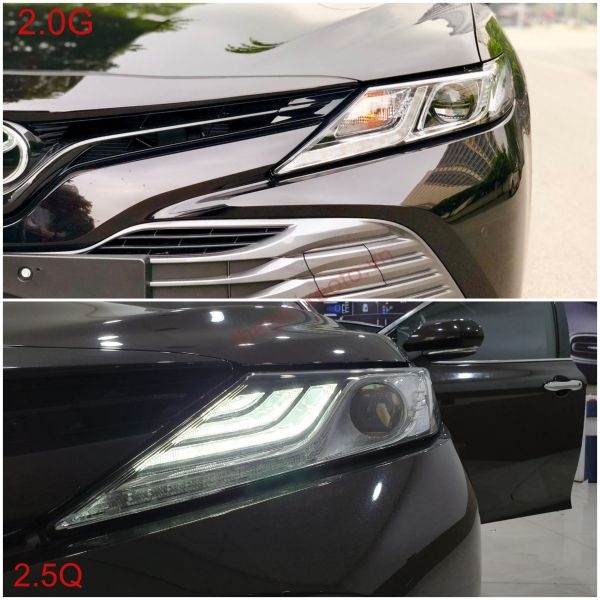 Phần đầu xe giữa Camry 2.0G và 2.5Q chỉ có sự khác biệt duy nhất về cụm đèn pha khi đèn pha Camry 2.5Q được trang bị đèn xinhan LED trong khi đó Camry 2.0G chỉ được trang bị đèn xinhan Halogel