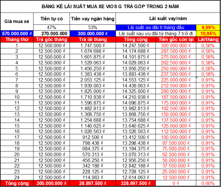 Bảng tính lãi suất mua xe Toyota Vios G trả góp trong 2 năm