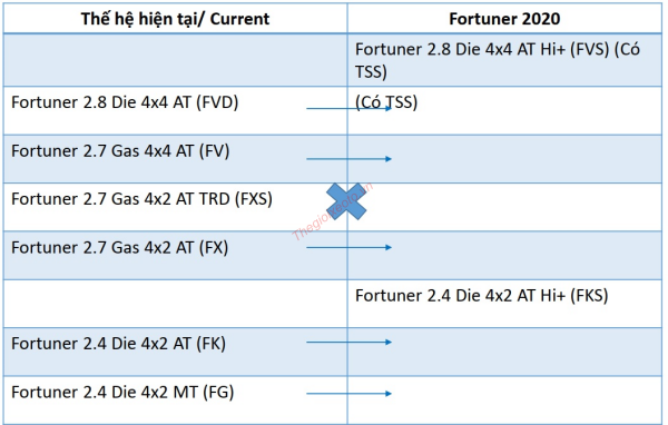 | 2 | Fortuner 2.4G 4x2 AT (FK) | Diesel 2.4L - 6AT | 1.080 tỷ | |