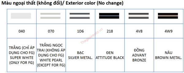 | Chú ý: Đối với màu trắng ngọc trai mã (070) giá xe sẽ tăng 8 triệu so với các màu khác | ||||